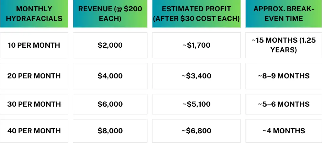 Upfront Investment: For our example, assume an initial cost of $25,000 for the device (rough midpoint of the range). Your goal is to earn at least $25k in profit from HydraFacial services to break even on that investment.